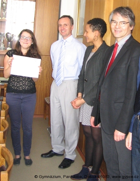 Diplomy předal pan Marc Brudieux, ataché pro francouzský jazyk z Francouzského Institutu v Praze, slečna Diana Bangoura, ředitelka Francouzské Aliance v Pardubicích a ředitel naší školy Luděk Burian.
