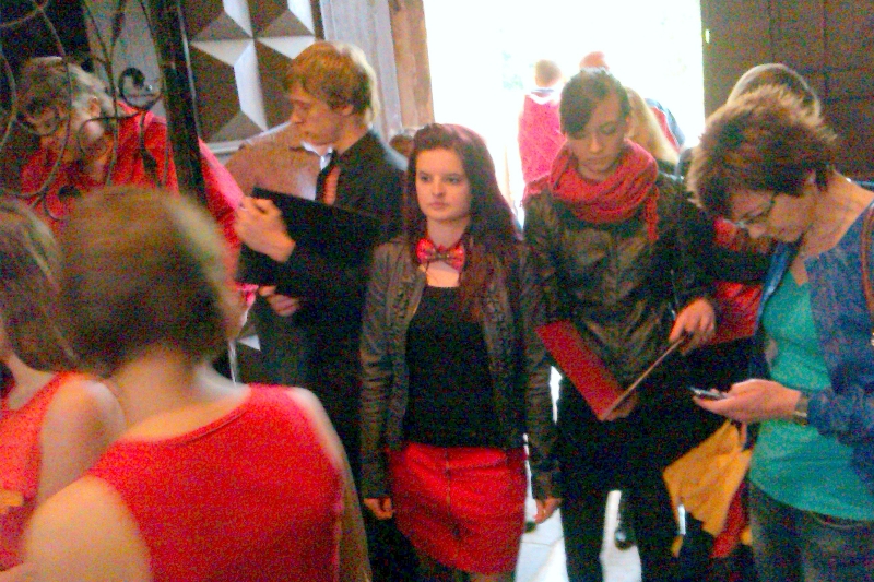 Ale už se blíží 14. hodina a s ní zvuková zkouška a následný koncert. Ten se měl původně konat na nádvoří, ale krátce před začátkem se rozpršelo tak silně, že nebylo vidět na krok. Nevadí, pořadatelé mají v záloze náhradní řešení. Kaple sv. Romedia choltického zámku svou akustikou stoprocentně podtrhla intonační a rytmickou suverenitu, kterou naši zpěváci prokázali, takže nejenom zkouška, ale především první festivalové vystoupení, při kterém jsme zazpívali skladby W. A. Mozarta, Uli Führeho a několik lidovek v originálním aranžmá, dopadlou na výbornou. Aplaus po prvním vystoupení trval déle, než jsme očekávali. V jeho průběhu nám pořadatelé předali drobné dárky. Po nás předstoupil před diváky dětský pěvecký sbor Rozmarýnek z Havířova, Myšáci z Řečan nad Labem, Pramínek z Pardubic a Zvoneček z Chrasti.