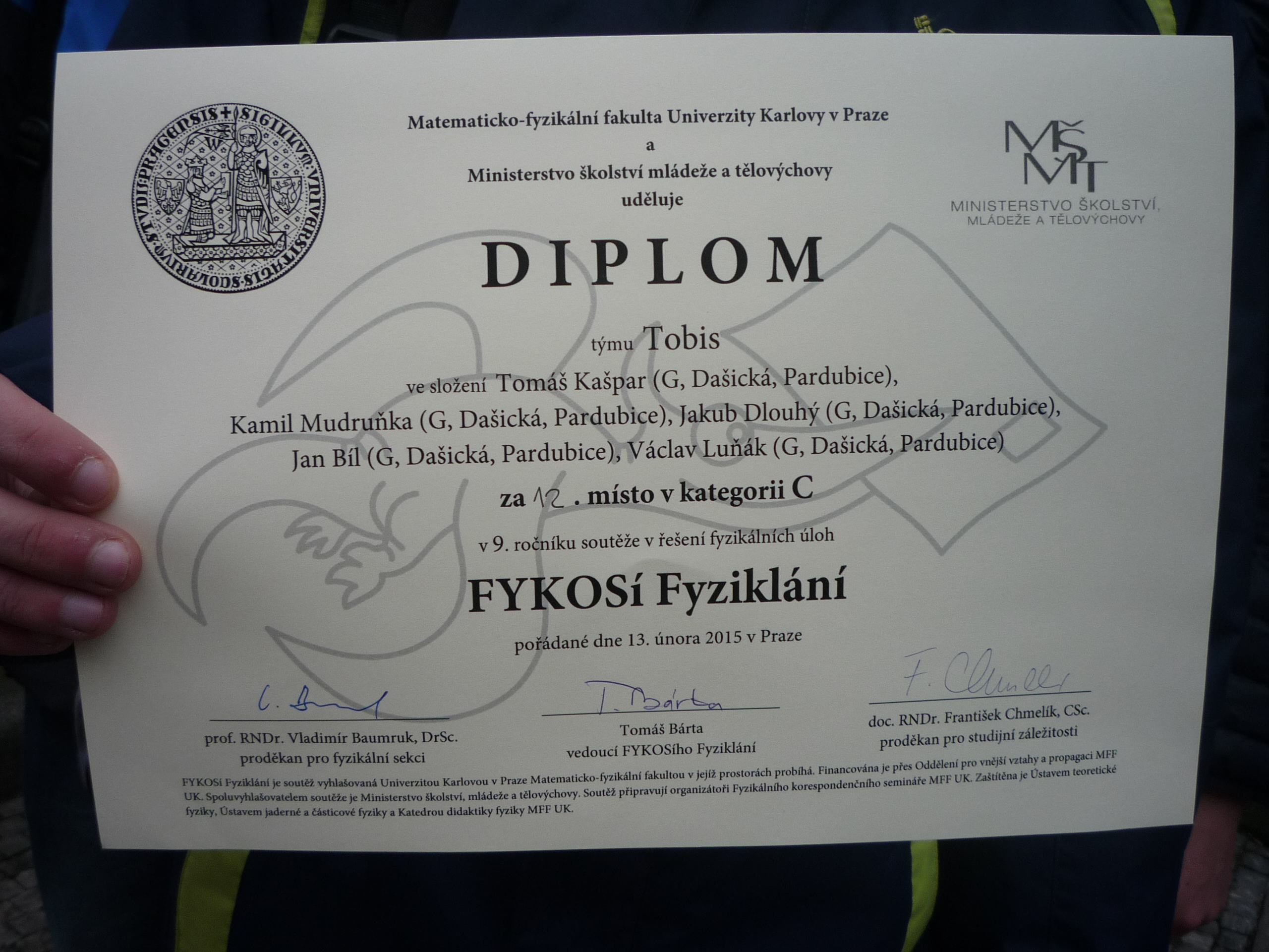 Dne 13. 2. 2015 se družstvo ve složení Tomáš Kašpar (3. H), Kamil Mudruňka, Jakub Dlouhý (oba 5. A), Jan Bíl a Václav Luňák (oba 6. B) zúčastnilo FYKOSího Fyziklání na MFF UK v Praze.