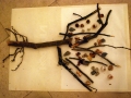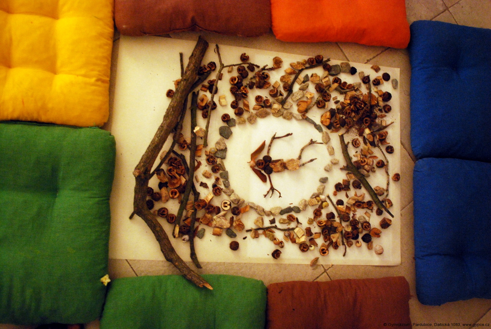 Dále následovala místnost, ve které byla stěna s fotografiemi, kromě toho také texty, sochy převážně z přírodních materiálů (např. strom ležící na posteli, dřevěná socha ženy s dítětem na vozíčku s názvem Madona na cestách, aj.). Poté jsme si rozdali tužky a pracovní listy, na kterých jsme měli k jednotlivým dílům přiřadit názvy. Byla to obrovská zábava, protože téměř nikdo neměl vše dobře.