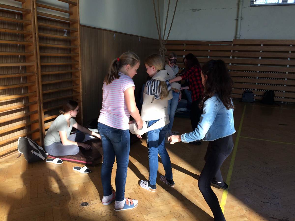 Dne 31. 10. 2019 se v malé tělocvičně naší školy konala akce nazvaná Halloween pro primy. Žáci a žákyně 1. A, B si měli možnost během hodiny angličtiny zasoutěžit na několika stanovištích, na kterých jim žáci ze tříd 7. B a 8. B připravili aktivity v anglickém jazyce s halloweenskou tematikou (pexeso, křížovky, vysvětlování slovíček ve dvojici, tvorba mumie apod.). Zároveň se žáci naučili anglickou písničku Black Cats Creeping a žáci v nejlepším kostýmu/masce byli odměněni malou sladkostí.