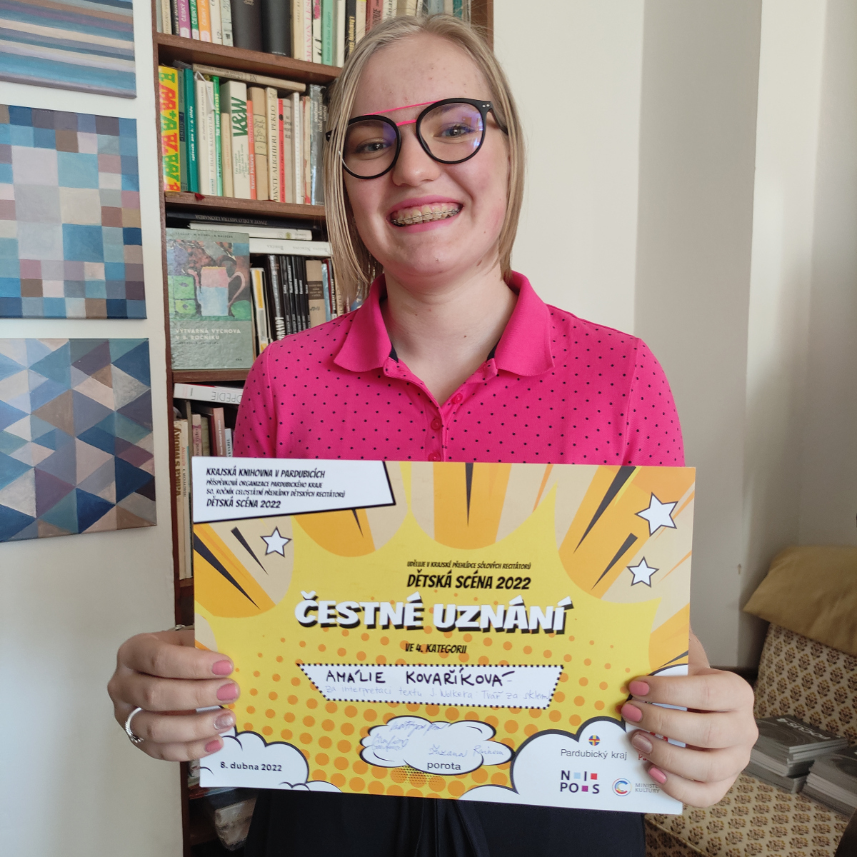 Ve dnech 7. a 8. 4. 2022 se v nových prostorech Divadla Exil a v sálech Národního památkového ústavu na Příhrádku v Pardubicích uskutečnilo Krajské kolo recitační soutěže Dětská scéna, v němž soutěžili v těchto dnech žáci III. a IV. kategorie. Naši školu tu zastupovaly Karolína Špinerová (1. A), Amálie Kovaříková ( 4. A) a Natálie Tučková ( 3. A). Všechny tři žákyně byly úspěšné!