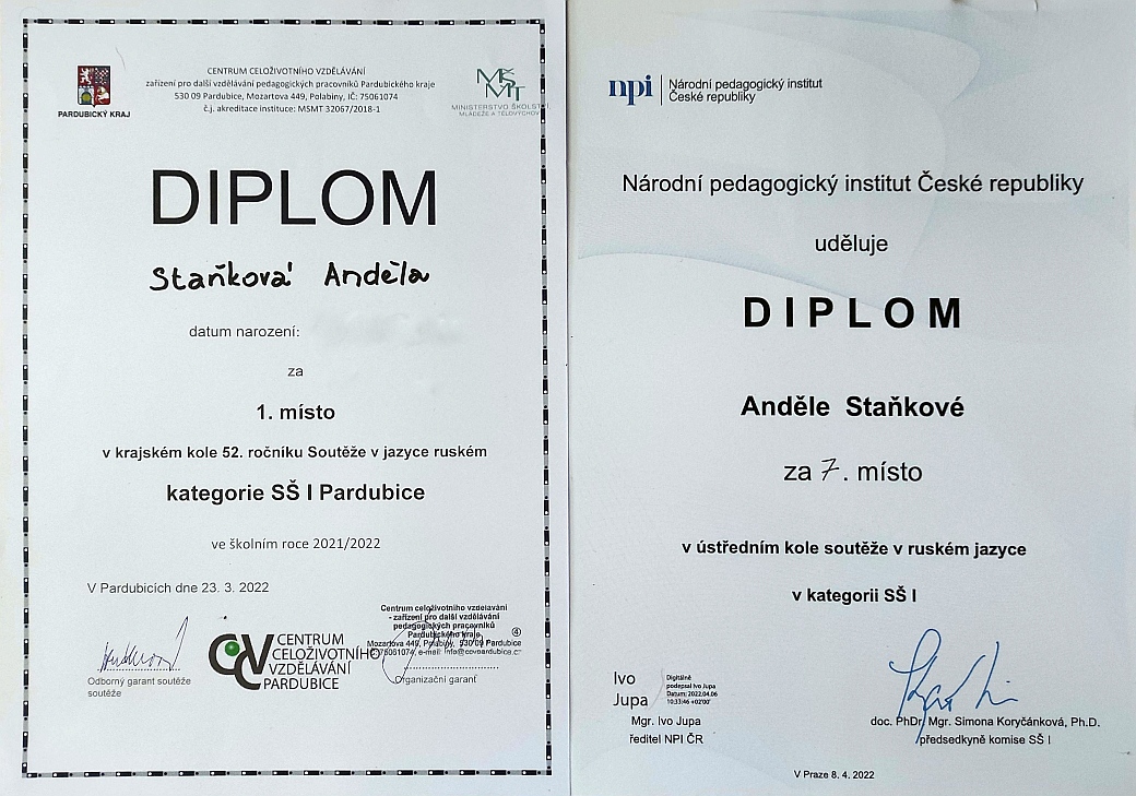Gymnázium, Pardubice, Dašická 1083 mělo letos své zastoupení i v Soutěži v ruském jazyce. Naše žákyně Anděla Staňková ze 6.B, soutěžící v kategorii SŠ I, nejprve s přehledem zvítězila v krajském kole, jež proběhlo na domácí půdě koncem března. Tímto skvělým výkonem se zasloužila o postup do celostátního kola, které proběhlo o měsíc později on-line. Tam se musela vypořádat kromě silné konkurence studentů z ostatních krajů i s nelehkým tématem a obsadila konečné 7. místo.
