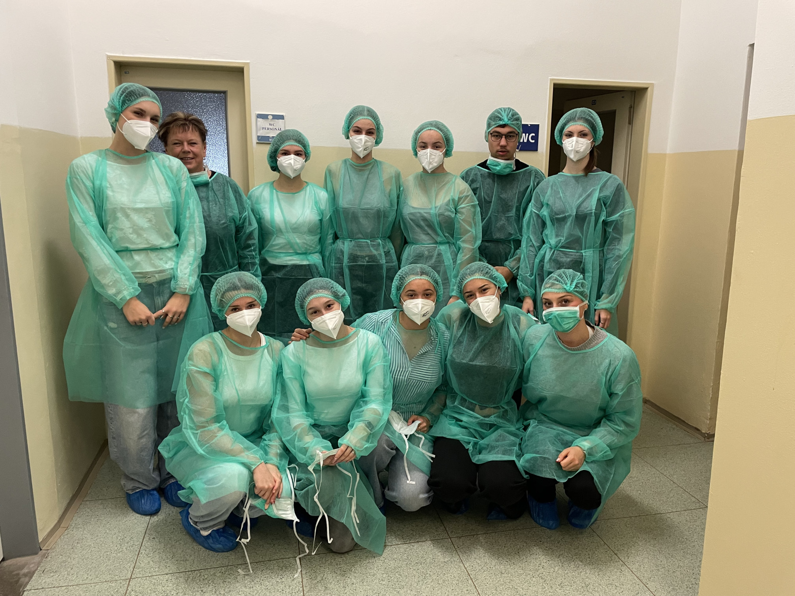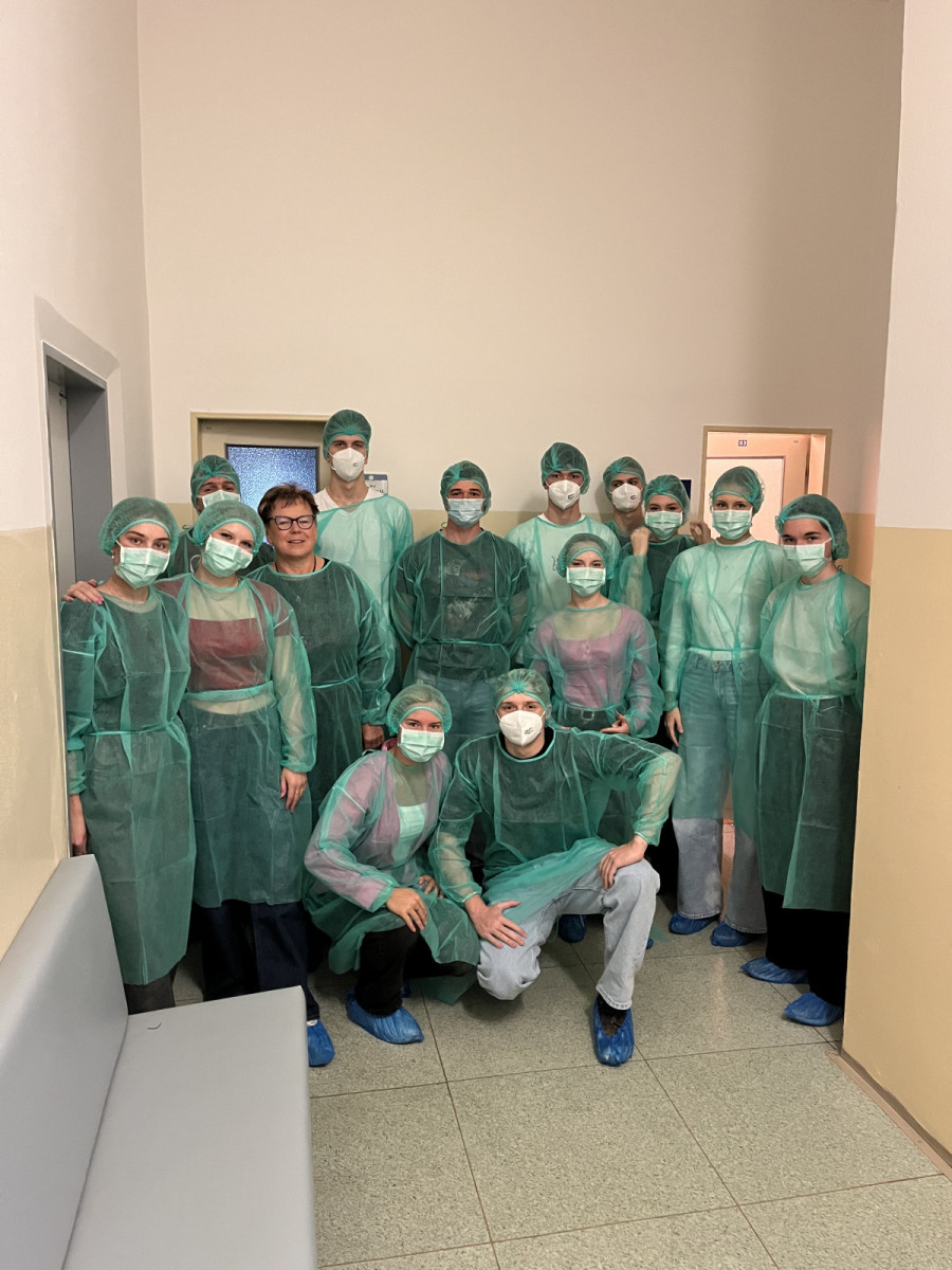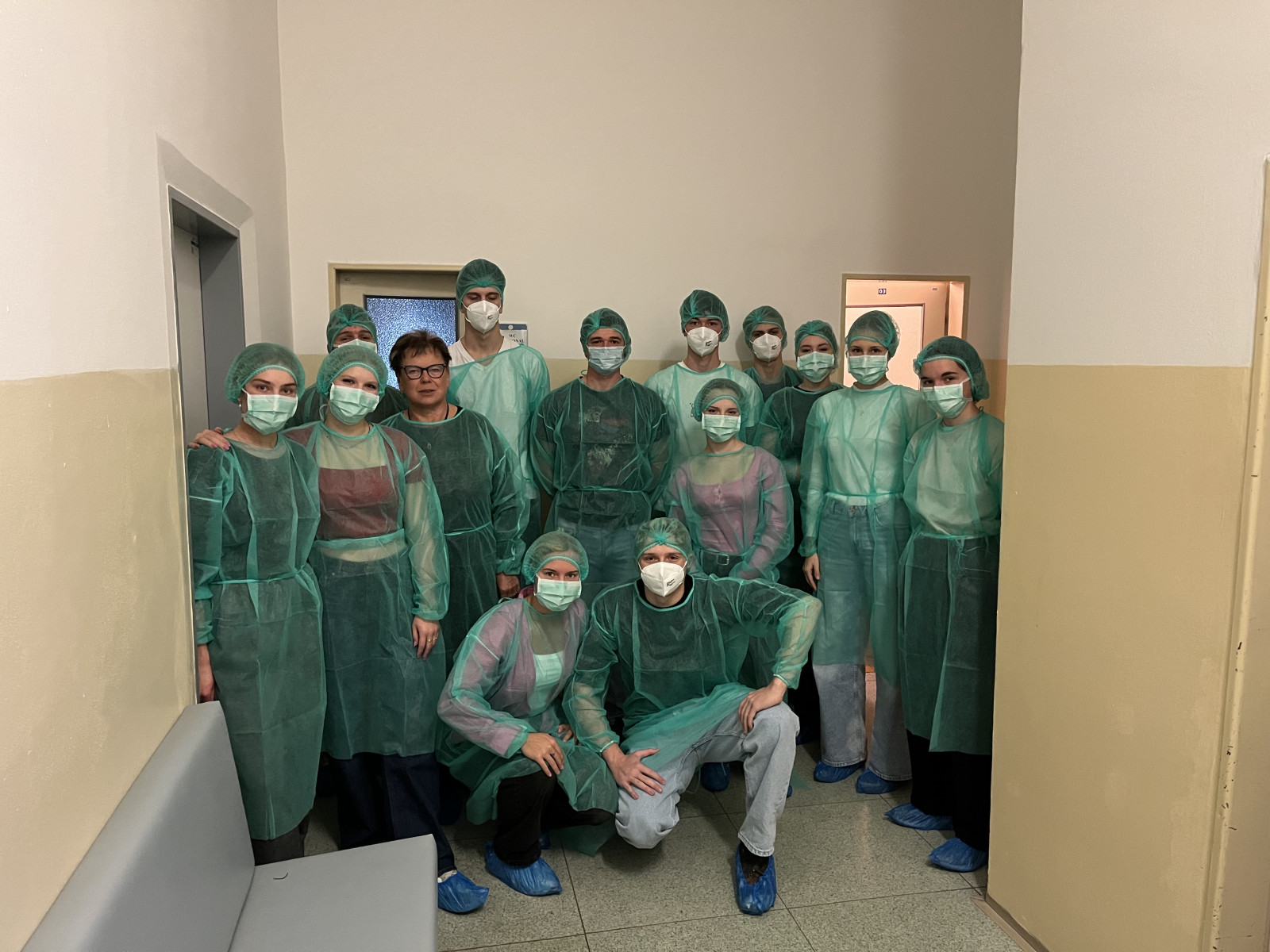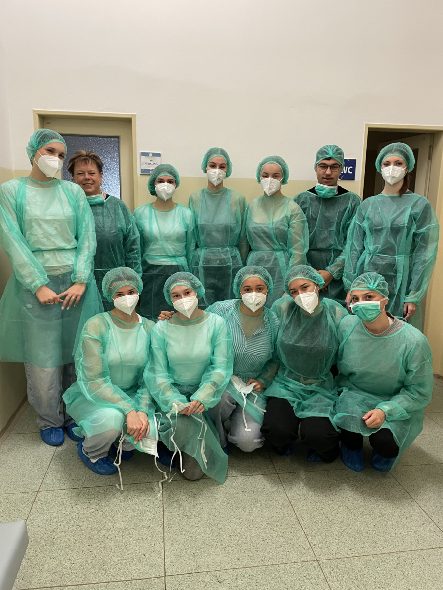 Náležitě oblečení v zelených pláštích s respirátory jsme statečně vyrazili na pitevnu vstříc novým zážitkům a zkušenostem. Měli jsme možnost podívat se na skutečné anatomické preparáty a na vlastní oči poznat strukturu orgánů, které jsme dosud znali jen z učebnic. Exkurze probíhala v klidné atmosféře díky MUDr. Janě Sekerové, absolventce našeho gymnázia, která nám při pitvě skvěle demonstrovala mnoho z anatomie i patologie vnitřních orgánů.