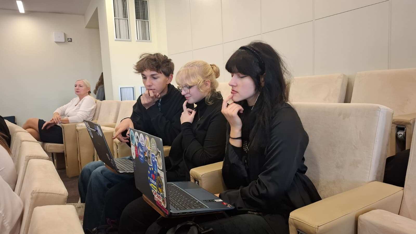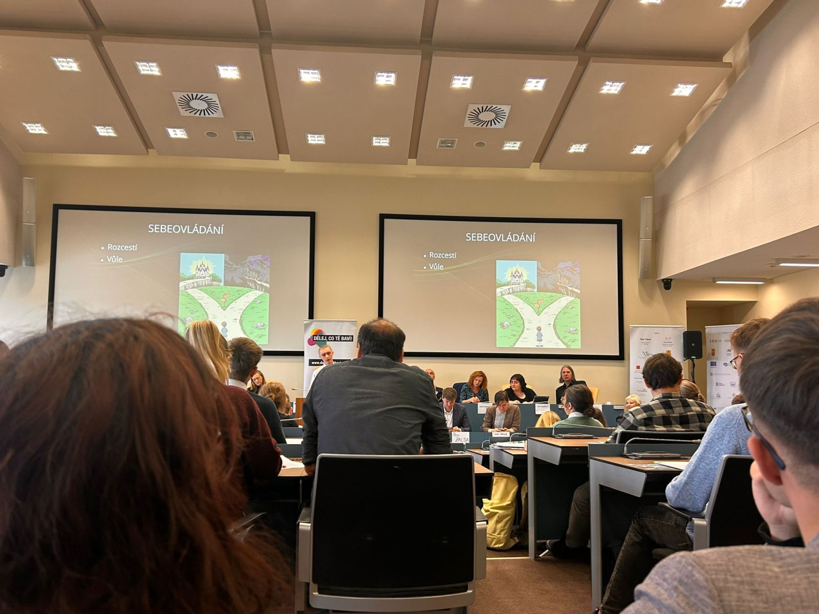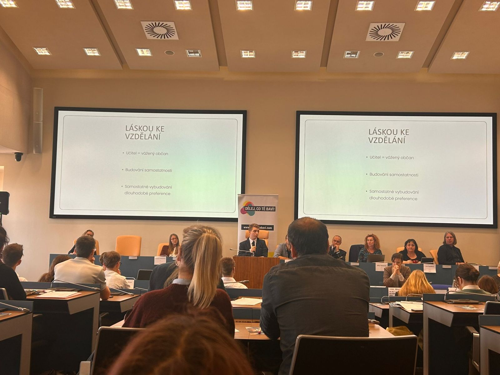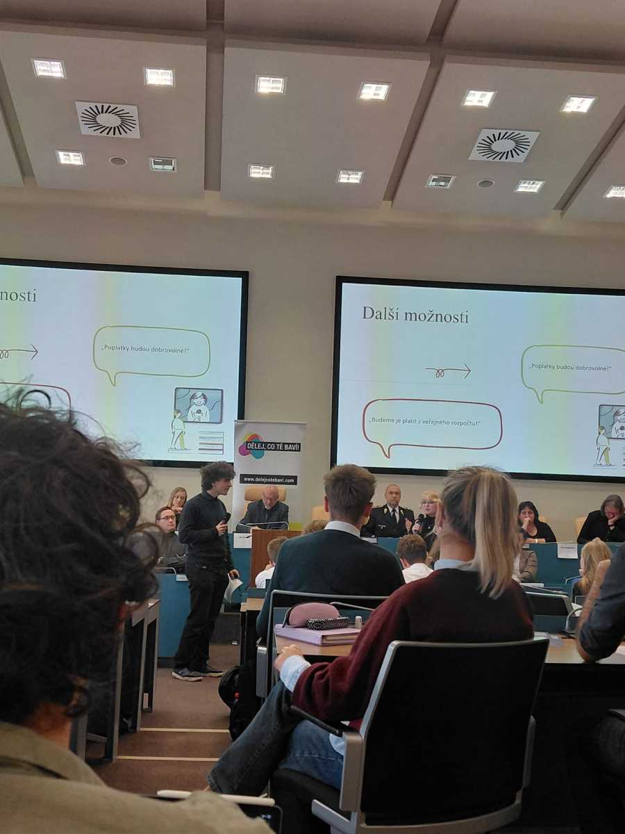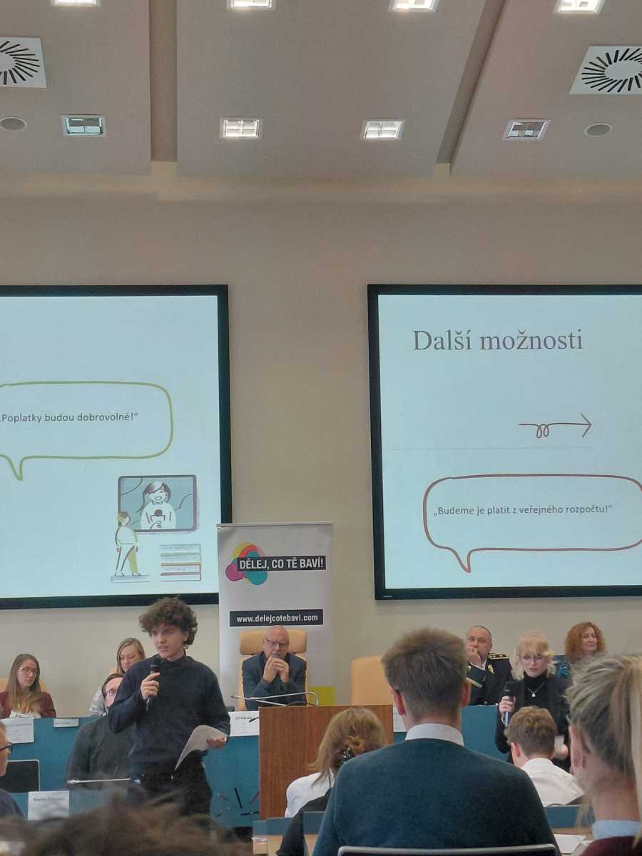 Této možnosti využili v poslední části naši studenti Magdaléna Hájková a Jakub Šmíd ze třídy 2.H, již prezentovali na téma koncesionářských poplatků. Krátce představili historii těchto poplatků, kdo je platí, kolik peněz Česká televize a Český rozhlas z nich získávají, a v neposlední řadě přednesli argumenty pro zachování a proti.